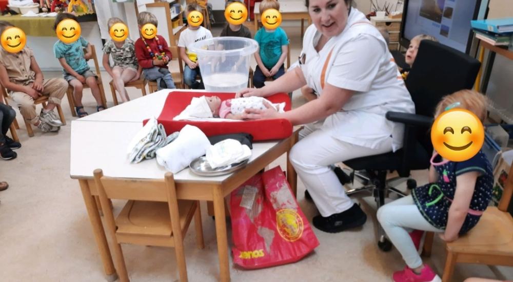 Omdat ze in de kleuterklassen het thema baby hebben mocht Henrieke (op verzoek van mijn nichtje die daar op school zit en haar schoonzusje die daar werkt als leerkracht) uitleg komen geven over haar werk als kraamverzorgende.